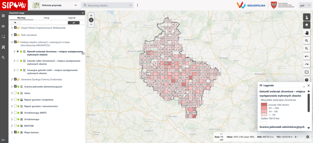 Z przyjemnością informujemy o kolejnym etapie współpracy Wydziału Biologii UAM z Urzędem Marszałkowskim Województwa Wielkopolskiego w zakresie publikacji danych przyrodniczych z bazy AMUNATCOLL IT w Systemie Informacji Przestrzennej Województwa Wielkopolskiego (geoportal SIPWW). Do opublikowanych już warstw tematycznych roślin chronionych i inwazyjnych dołączyły warstwy zwierząt chronionych, powiększając całkowitą liczbę rekordów do ponad 68000. W ramach tej liczby 1600 rekordów stanowią okazy roślin inwazyjnych, ponad 2100 rekordów to okazy roślin chronionych oraz niemal 65000 okazów zwierząt chronionych.